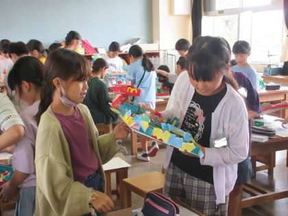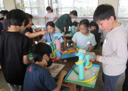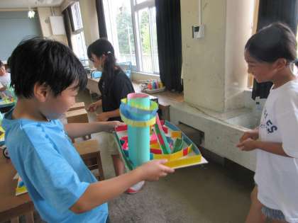 図画工作科で取り組んでいた「コロコロガーレ」が完成しました。今日は、1、2組合同で、コロコロガーレのお試しを行いました。子供たちは、「友達によって工夫しているところが違って面白かった」「地下までつながっているもあって、すごいと思った」等、感想を話してしました。いろいろな友達の作品に触れ、遊んで、子供たちは思い切り楽しんでいました。