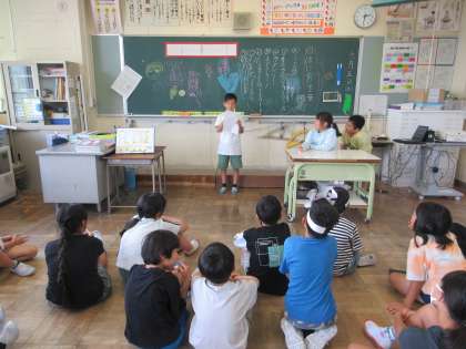 先日の四つ葉タイムに学校内で「自慢大会」が行われました。その大会後、4の1のクラスでも自慢大会を開催したいと係の子供たちが計画し、学級活動の時間に「4の1自慢大会」を行いました。カニカニパフォーマンスや手品、ダンス等、それぞれの子供たちがみんなの前で一生懸命特技を披露しました。みている子供たちもとても楽しかったようです。クラスのみんなが楽しくなる活動を、これからも進んで計画していってほしいと思います。