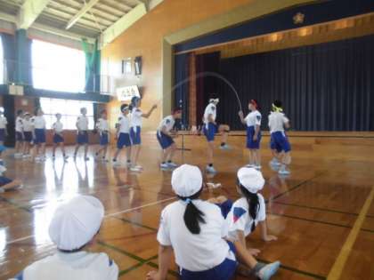 体育の時間にスポーツテストをしました。反復横跳びです。6年生に回数を数えてもらいました。その後は、6年生に大縄の8の字跳びを見せてもらいました。69回跳んでいたのですが、普段はもっと高速で跳ぶということで、1年生の子供たちはみんな驚いていました。6年生と一緒に行った体育はとても楽しく、がんばった子供たちでした。