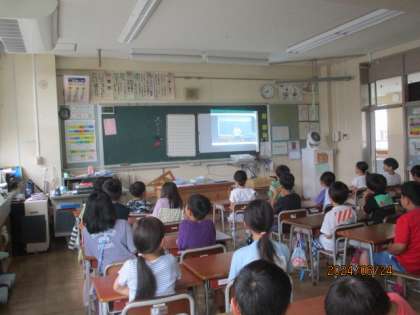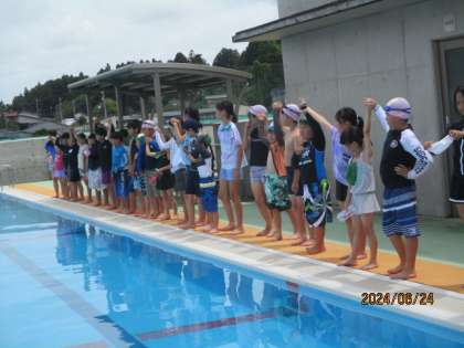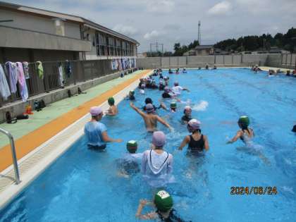 プール開きをしました!! 2年生 公開日 2024/06/24 更新日 2024/06/24 第2学年 6月24日(月) 今日は、待ちに待ったプール開きがありました。まず、教室で校長先生とプール担当の先生のお話をオンラインで聞き、プール学習の目標やプール学習で気をつけることにちて確認しました。。その後、交流学年の5年生と一緒にプール学習をしました。5年生の模範水泳を見せてもらったり、5年生と一緒にプールの中で遊んだりし、楽しい時間を過ごすことができました。