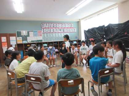 今日は、これまで子供たちが準備を進めてきた1学期お楽しみ会の日でした。第一部は、クイズやフルーツバスケット、ばくだんゲーム、じゃんけん列車をして楽しみました。第二部は、教室を使っておばけやしきをしました。子供たちは、友達と一緒に仲良く、楽しく活動することができました。