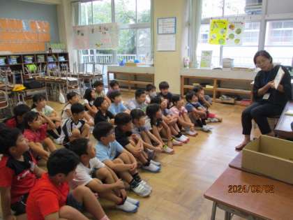 写真下は、お話ミッケの会の様子です。お話ミッケの会の方の読み聞かせに、まるでお話の世界に引き込まれているかのように、集中して聴いている姿がとても印象的でした。