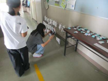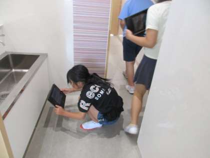 今日の家庭科の学習では、どんな場所に、どんな汚れがあるかを調べました。もし、1週間に1度程度しか掃除をしなかった場合、1平方メートルの中に350匹のダニが発生することを知り、子供たちは、掃除の大切さを感じていました。その後、実際に教室や廊下、階段、トイレなどに行き、様々な汚れを見つけてスライドにまとめました。