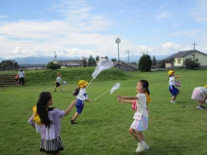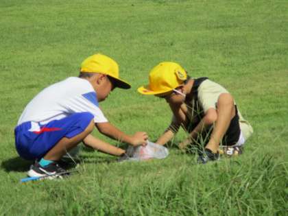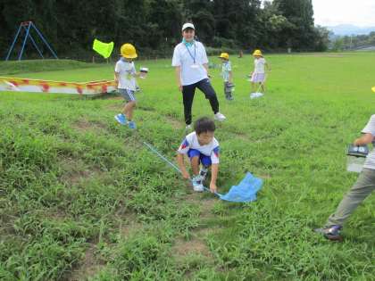 バッタに、コオロギ、トンボなどたくさんの虫がいました。子供たちは、腰を低くしてバッタを探したり、虫網を振り回してはトンボを追いかけたりしていました。「虫はちょっと苦手なんだけど」と言う子供も、友達と一緒に虫を探していました。