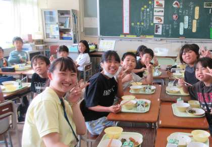 今日の給食の時間は、教育実習の2名の先生と一緒に食べました。子供たちは、先生や友達と話をしながら、とても楽しく給食時間を過ごすことができました。