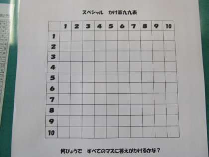 算数の教科書9ページの九九表か、自分で作った九九表でもよいので、すべてのマスに答えをかいてみましょう!ちなみに先生は10×10のマスで90びょうでした。このきろくがぬけるかな?