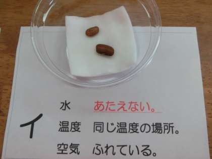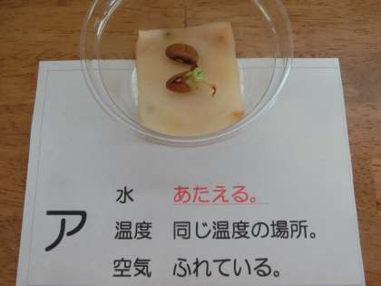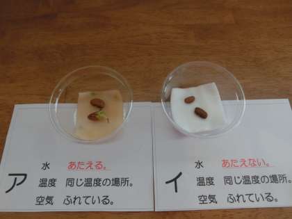 5年生 種子が発芽する条件を調べよう(結果A水) 公開日 2020/05/21 更新日 2020/05/21 第5学年 実験A 水と発芽 ○発芽に水が必要かどうかを調べる実験の結果は、写真のようになりました。 ア.水をあたえると発芽した。 イ.水をあたえないと発芽しなかった。 ☆この結果から「種子が発芽するためには、水が必要」なことが分かりますね。