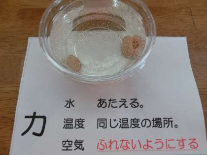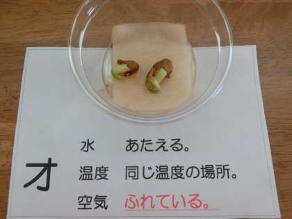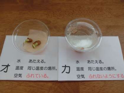 5年生 種子が発芽する条件を調べよう(結果C空気) 公開日 2020/05/21 更新日 2020/05/21 第5学年 実験C 空気と発芽 ○発芽に空気が必要かどうかを調べる実験の結果は、写真のようになりました。 オ.空気にふれていると発芽した。 カ.空気にふれていないと発芽しなかった。 ☆この結果から「種子が発芽するためには、空気が必要」なことが分かりますね。