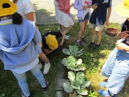 臨時休校中に中庭で育てていたキャベツに、モンシロチョウの幼虫の青虫がついていました。教室で育てていると、さなぎになり、ついにチョウに成長しました。教室から飛び立ったチョウは近くの桜の葉の周りを飛びながら、みんなの様子を見ているようでした。