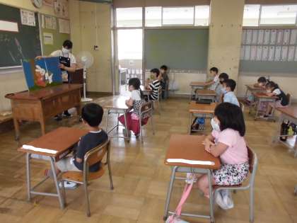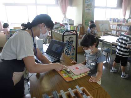 1年生 読書の森 公開日 2020/06/17 更新日 2020/06/17 第1学年 学校司書から大きな絵本の読み聞かせをしてもらい、読書の森(図書室)で貸出をしました。2回目ということで、バーコードの見せ方も上手にできました。本が大好きな1年生です。