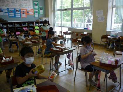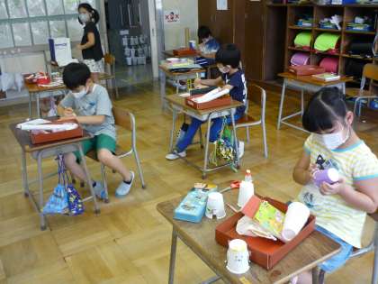 生活科「うごくうごくぼく・わたしのおもちゃ」の学習で、子供たちはおもちゃ作りに一生懸命取り組んでいます。