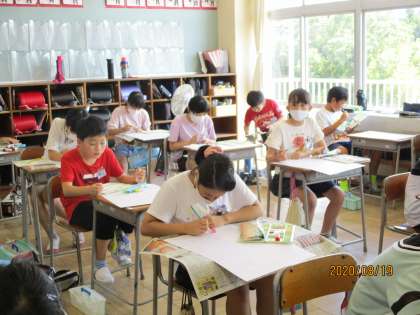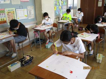 6年生は、防火ポスターを描いています。今日から色を塗り始めました。完成が楽しみです。