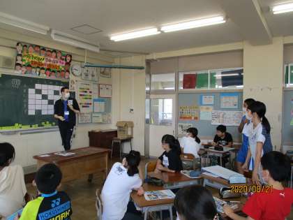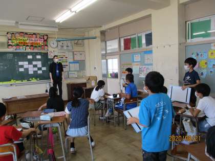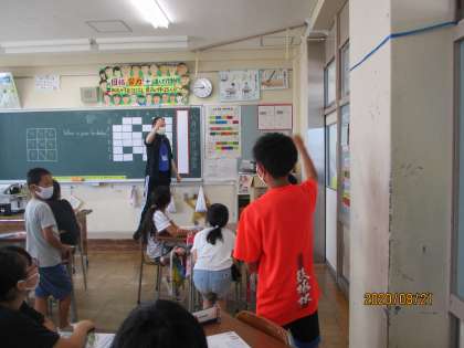 今日は、外国語科の授業がありました。ALTの先生と一緒に、英語を使って「タイフーンゲーム」をしました。子供たちは、とても楽しく学習に取り組んでいました。