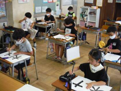 2学期になって、初めての書写の時間でした。今日は「木」という文字に挑戦しました。1年生で習った漢字ですが、いざ書いてみると、左はらい・右はらいの力の入れ具合が難しく、何度もお手本を見ながら確認していました。ポイントを意識しながら、納得のいく「木」が書けるとよいですね。