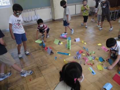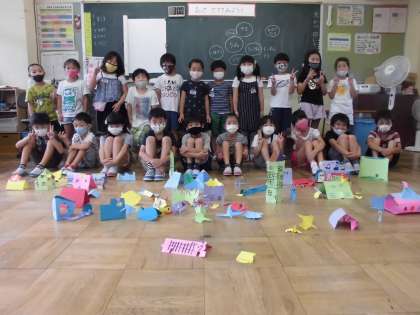 図画工作「おって たててみよう」の学習では、画用紙を折って立て、飾りを付ける活動をしていました。