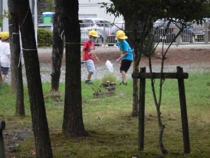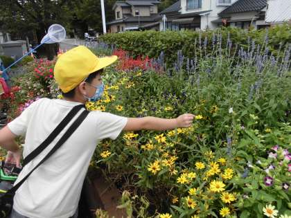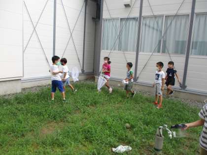 外に出て、虫探し。蝶やコオロギ、トンボを見つけ、捕まえたものは自分の虫かごに入れました。虫たちを追いかける元気な姿がたくさん見られました。