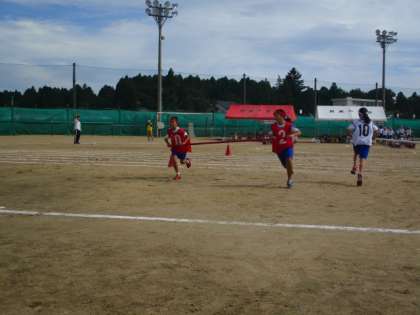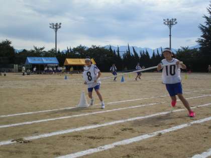 3・4年生 運動会 ビッグタイフーン 公開日 2020/09/16 更新日 2020/09/16 第4学年 3・4年生の団体競技は「ビッグタイフーン」です。 コーンを回るとき、中心になる子はしっかりと棒を持って踏ん張り、外側の子は全力で走るなど、2人で息を合わせてがんばっていました!