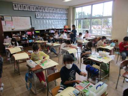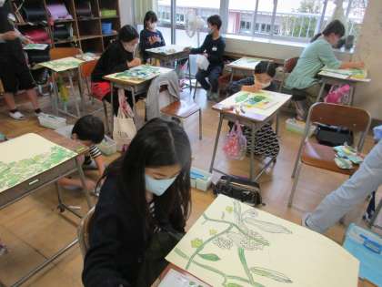 ヘチマの色は、黄緑、緑、濃い緑などを使い分けて彩色しています。