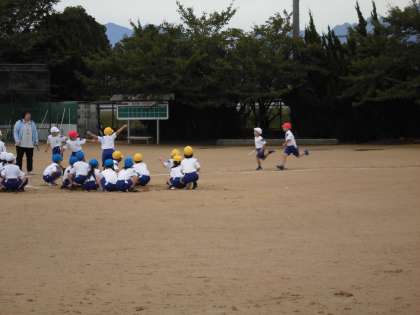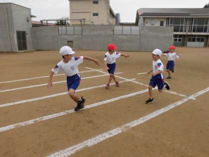 運動会の選抜リレーに出場した子供以外は、トラック半周を走ることは初めてです。大きなトラックにびっくりしていた子供たちですが、力いっぱい走り、バトンをつないでいました。