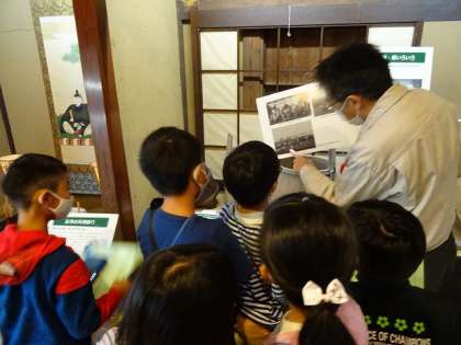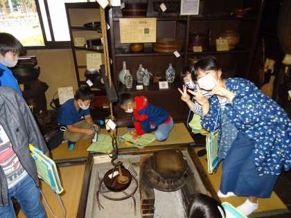 囲炉裏のある場所では、「漫画に出てくる場所と同じだ!」と漫画で知った昔のくらしが本当にあったことに感動していました。屋根裏部屋にあった昔の道具がわらや木でできていたことに、「昔の人は手先が器用だな。」と感想を話していました。