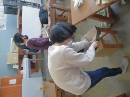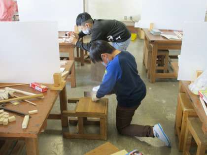 4年生 図画工作科 公開日 2020/11/12 更新日 2020/11/12 第4学年 図画工作科では、木材をのこぎりで切って作品を作っています。真剣な顔でのこぎりや金鎚を使っていて、まるで大工さんのようでした。 オリジナルの壁掛けやペン立てなどを作ります。