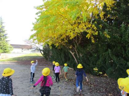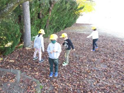 学校のグラウンドや中庭で秋の終わりを見つけました。立山連峰に雪が積もっている様子や葉っぱがたくさん落ちている様子などいろいろな発見がありました。赤や黄色の葉っぱを見つけたり、クヌギの実や杉の実を拾ったりしました。