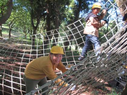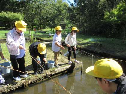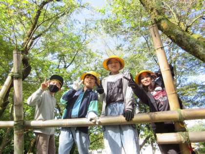 1日目午前の活動。ザリガニ釣り、竹ジャングル遊び(2組)の様子です。