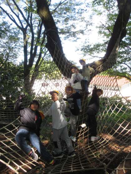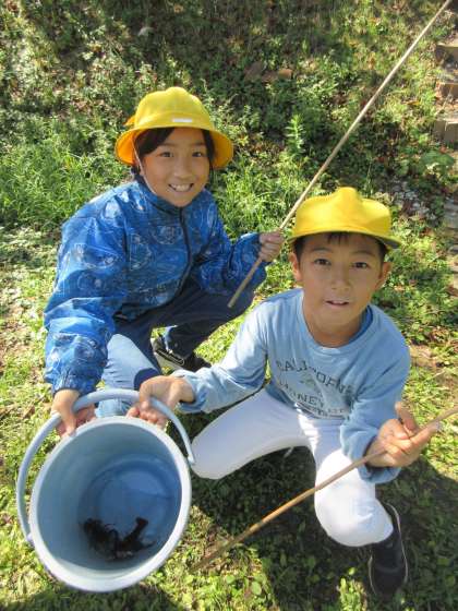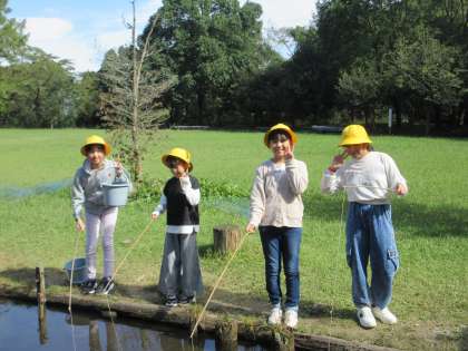 ザリガニ釣り、竹ジャングル遊び(1組)の様子です。