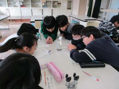 理科の学習で、塩を水に溶けていく様子を観察しました。じっくり見ていると、塩の入ったペーパータオルから、もやもやしたものが溶け出していきます。「何これ?」「うずを巻いてるみたい」「すごい幻想的!」と、初めて見た現象に対して、興味をもって観察していました。