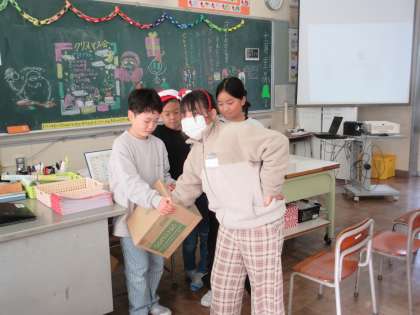 今日、4年1組では2学期最後の「誕生日&お楽しみ&クリスマス会」を行いました。ハンカチ落としやフルーツバスケット、くじ引きに加え、箱の中身は何かなゲームや人狼ゲームクリスマスバージョンなど、新しいゲームもあり、みんなで楽しい時間を過ごすことができました。
