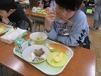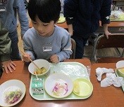 1年生 見て、見て! かわったよ! 公開日 2025/01/29 更新日 2025/01/29 第1学年 給食に「サイエンスサラダ」が出ました。紫キャベツに塩レモンのドレッシングをかけると、色が変わります。ドレッシングをかけた後、どうなるかじっと見ていました。「あっ、変わってきた」「見て、ピンクになってきたよ」と友達とサラダを見せ合っていました。いつもよりも賑やかな給食の時間でした。 1年生