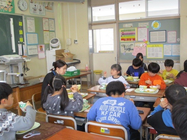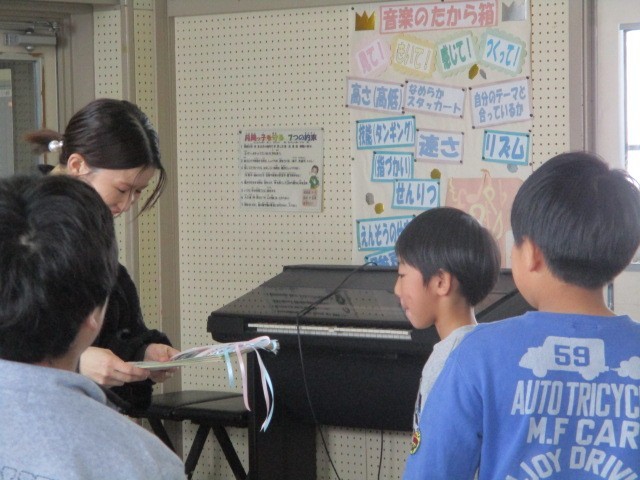 今日は、2年生で最後の音楽の授業でした。音楽の授業はいつもとても楽しく、2年1組のみんなが大好きな教科の1つでした。音楽の先生には、連合音楽会の歌の指導をしていただいたり、ピアノ伴奏をしていただいたりもしました。授業の最後に、2年1組のみんなで、お礼の気持ちを伝え、みんなで書いたお手紙を渡しました。その後、教室で音楽の先生と一緒に給食の会食会をしました。1年間本当にありがとうございました。