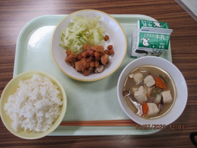 ごはん、牛乳、鶏肉とひよこ豆の甘からめ、ゆでキャベツ、けんちん汁