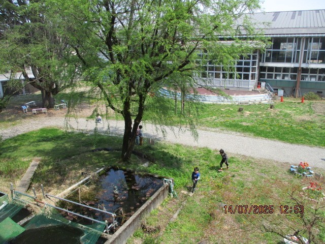 肌寒い日が続きましたが、今日は、あたたかい日差しがある春らしい日になりました。月岡っ子は、花が咲く中庭で思い思いに遊んでいました。