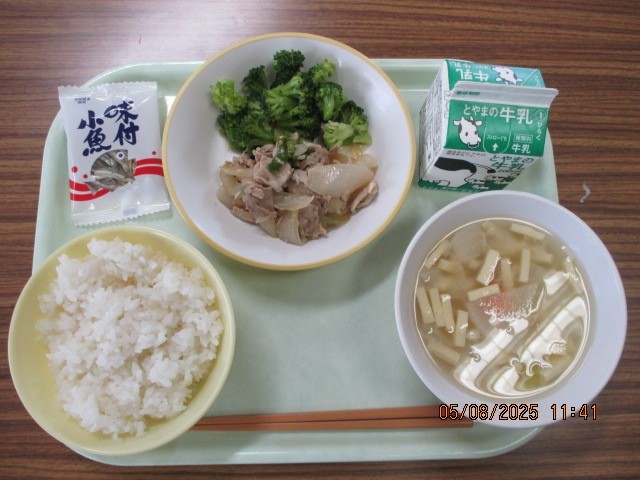 ごはん、牛乳、焼き肉、ゆでブロッコリー、みそ汁、味付け小魚