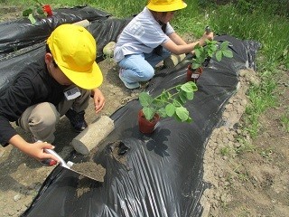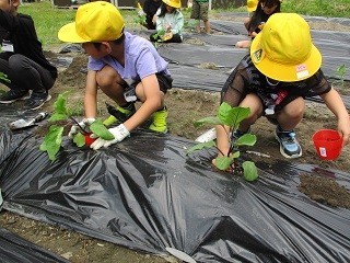 野菜の苗を畑に植えました。一人一人が育てたい苗を選び、きゅうりやピーマン、枝豆等夏の野菜を育てます。