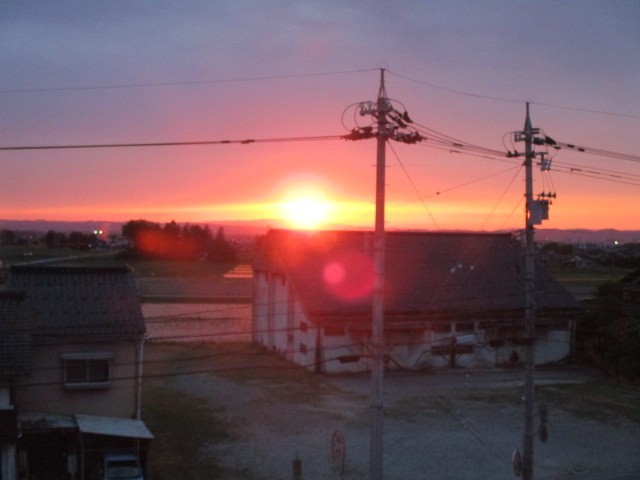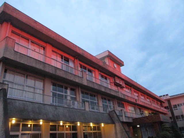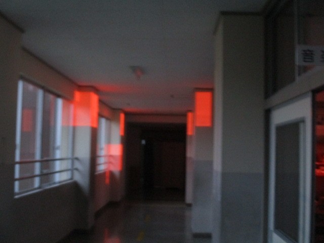 今日の夕日は、オレンジ色ではなくショッキングピンクに近い感じでした。校舎の外も中もショッキングピンクに染まり、何か不思議な感じがしました。なぜ、こんな色に見えるのだろう?
