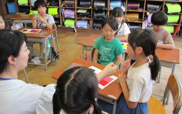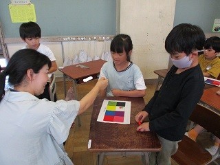 外国語専科の先生と一緒に、自分の好きな色を伝える学習をしました。