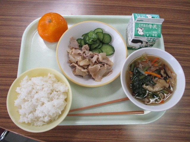 ごはん、牛乳、豚肉のジャンロー、きゅうりもみ、沢煮椀、冷凍みかん