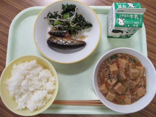 ごはん、牛乳、いわしの土佐煮、いそあえ、高野豆腐のごまみそマーボー