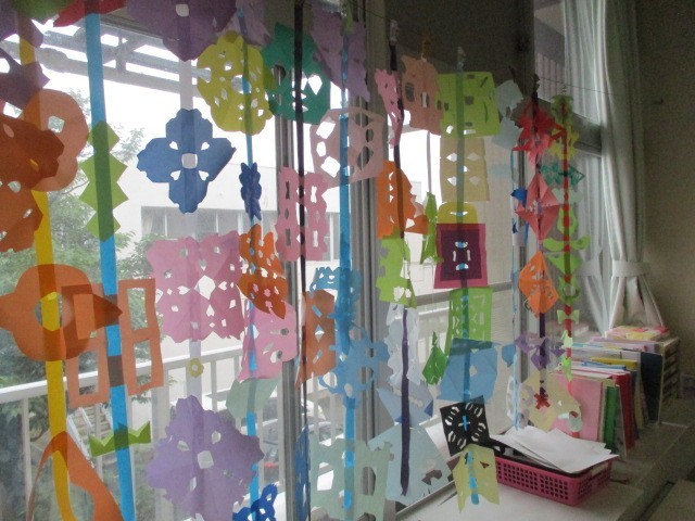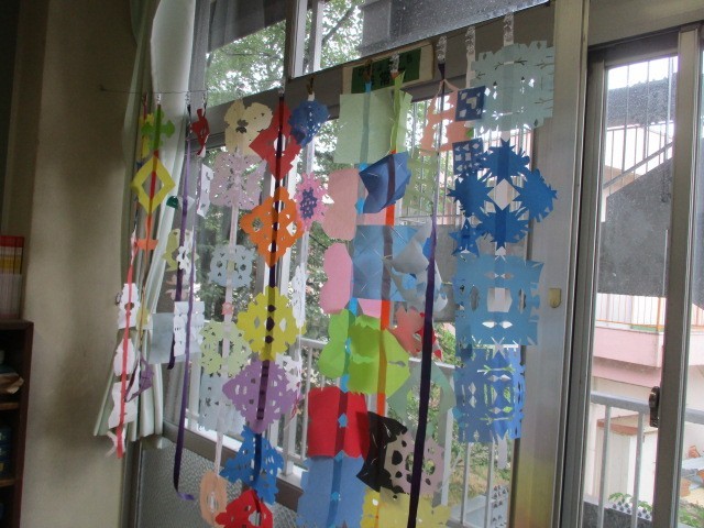 気象庁によると、北陸地方も梅雨入りしたと発表がありました。朝から雨もうようで、少し蒸し暑い日となっていますが、1年生の教室の窓に素敵な飾りができていました。折り紙を折って、はさみで「ちょきちょき」開いてみると・・・。思った通りの模様になるときも、思ってもいない模様になるときも、そんな発見をたのしむ学びです。