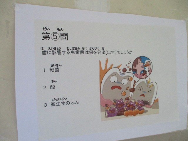 保健委員会が、歯の衛生週間の活動を始めています。校内にクイズを張り出し、口の中を清潔に保つことの大切さを全校に広めています。