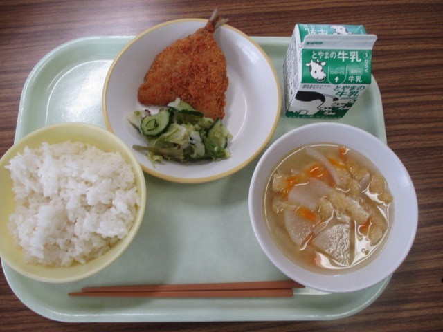 ごはん、牛乳、あじフライ、かいそうサラダ、みそ汁