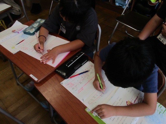 2年生の国語科で授業研究を行いました。子供たちは、教材文「スイミー」の世界に浸って、主人公スイミーになったつもりで、スイミーの気持ちをノートに書いたり、隣のペアの友達やクラスの友達に自分のかんがえを伝え合っていました、物語と対話し、友達と対話することで、自分の考えが広まったり深まったりします。これが「よく考える」につながると思います。