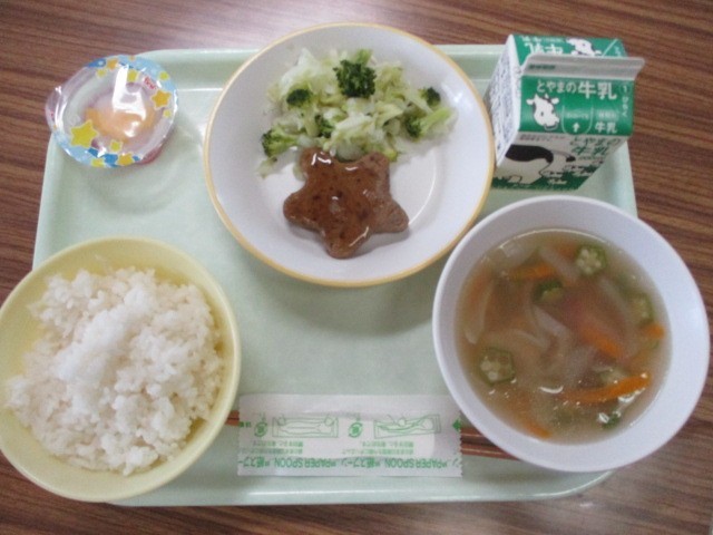 ごはん、牛乳、星形ハンバーグ、そえ野菜、天の川スープ、七夕ゼリー