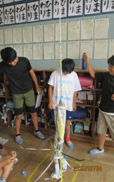 集会をしました!フルーツバスケット、だるまさんの一日をしたあとに、新聞をどれだけ高くできるかチャレンジをしました!テープしか使えないという条件で、子供たちはどのようにしたら新聞が立つのかを班のみんなと試行錯誤しながら取り組んでいました!集会の中でうまくいかなかった子供たちは、集会後に再挑戦し、身長よりも高く新聞を立てることができました。子供たちは大満足です。