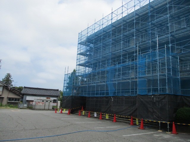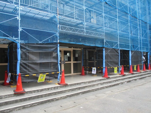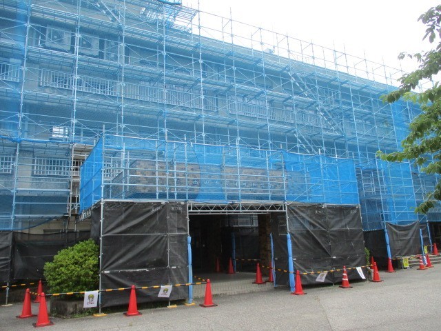 先週末から、管理棟(玄関がある棟)の外壁工事が始まりました。大きな足場が組まれ、児童玄関、正面玄関への入り口が狭くなっています。子供たちの登下校時には十分注意して見守っていきます。