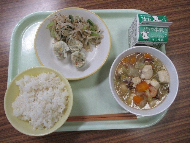ごはん、牛乳、野菜シュウマイ、ナムル、エビと豆腐のうま煮