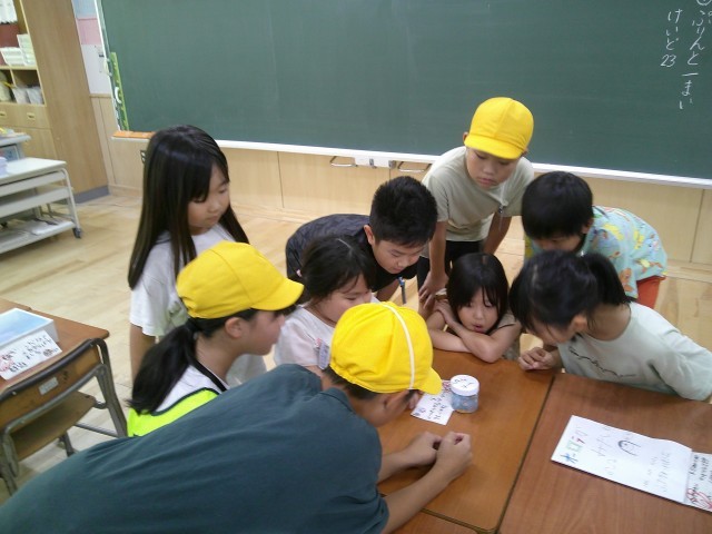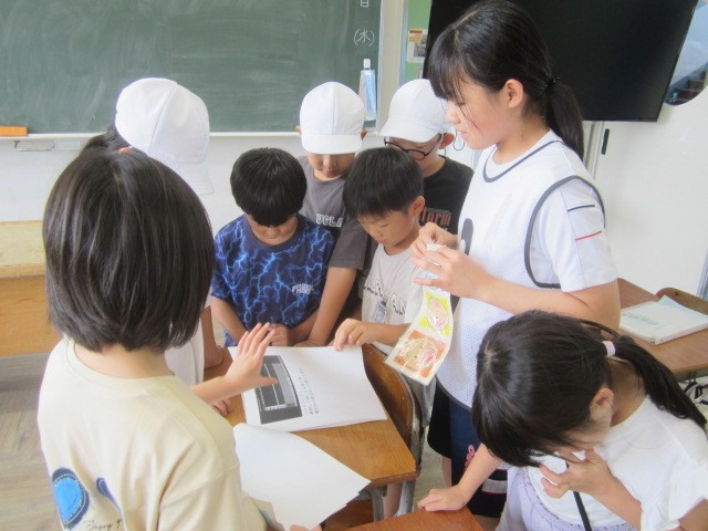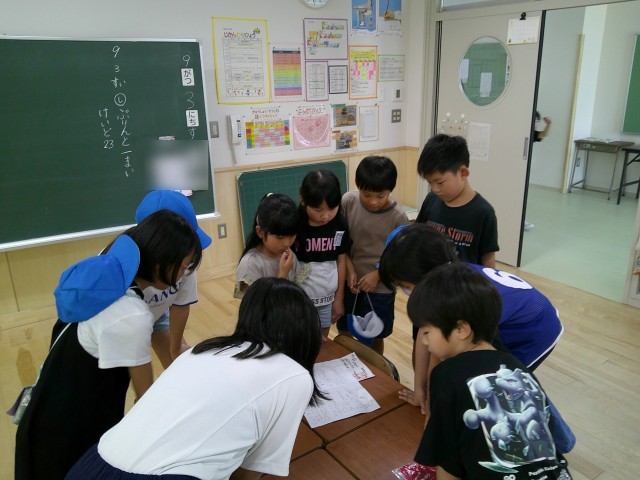 今日の新保っ子タイムは、「縦割り班de作品展覧会」を行いました。夏休みに頑張って取り組んだ自由研究を見て、仲間の頑張りやいいところを見付け合いました。「どうやって作ったの?」「作るの難しそう!すごい!」と、お互いにいいところを認め合いながら、作品を見て回っていました。