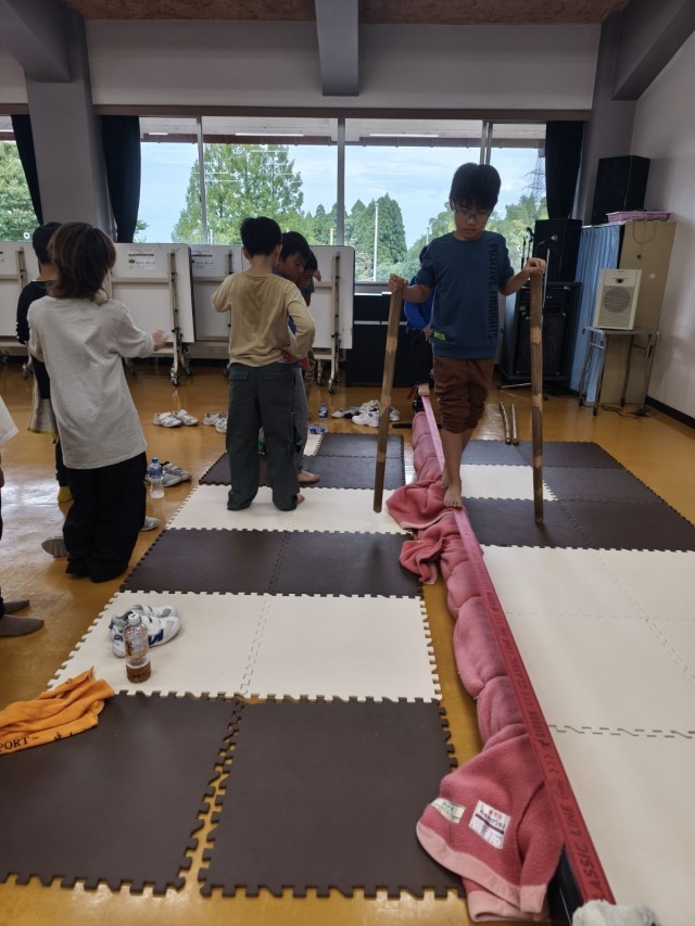 室内遊びの様子です。スラッグラインやカーリング等を楽しみました。
